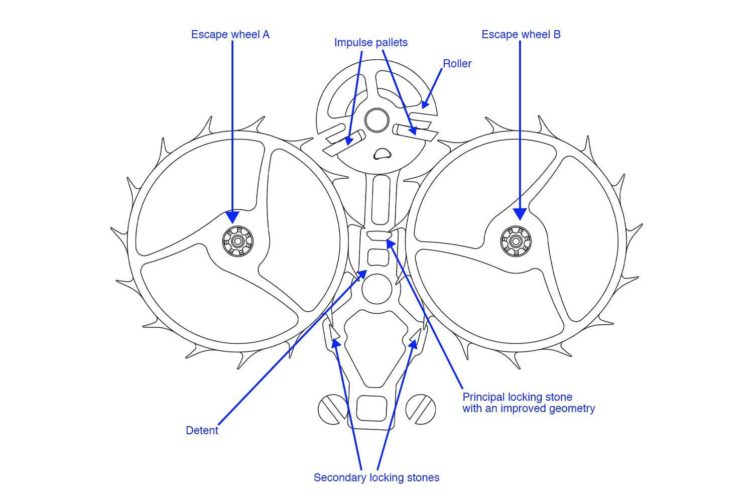 Bernhard Lederer’s key accomplishment with the independent double-wheel escapement is its self-starting ability. At low amplitudes, a tooth of the escape wheel that previously rested on the principal locking stone rides over a minute sloped surface. As it does, it nudges the detent sideways, prompting a rotation of the double roller. This ensures that the impulse pallet consistently remains positioned in front of the tooth responsible for direct impulse transmission