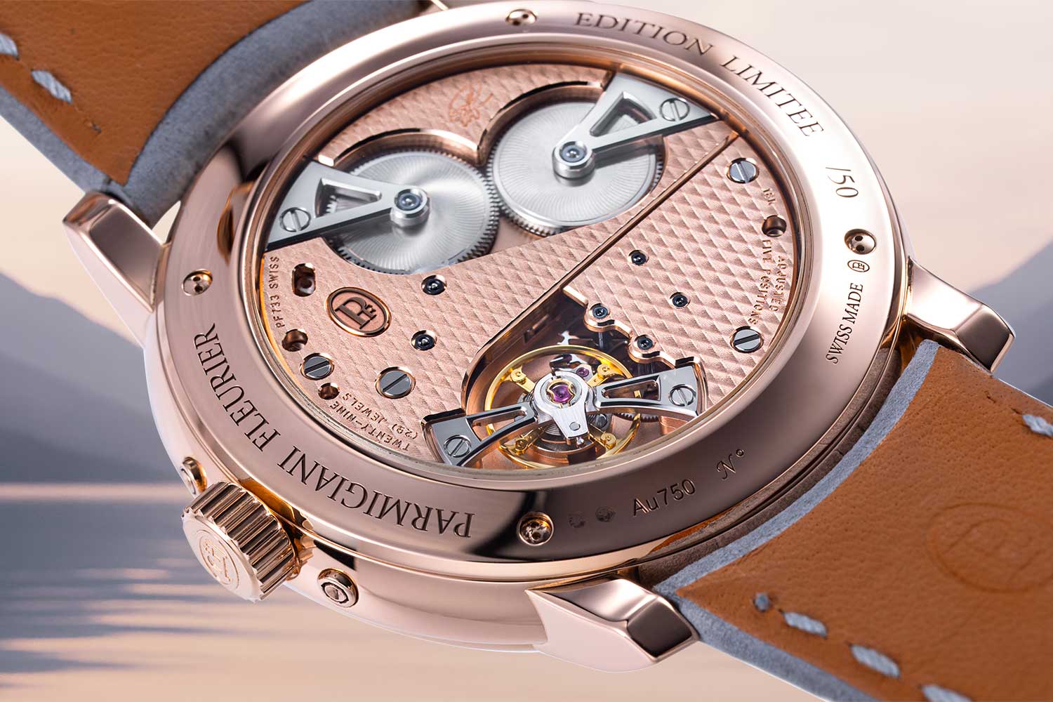 The manual winding Caliber PF733 is created entirely in solid 18K gold with finishes including Côtes de Fleurierand hand-beveled bridges