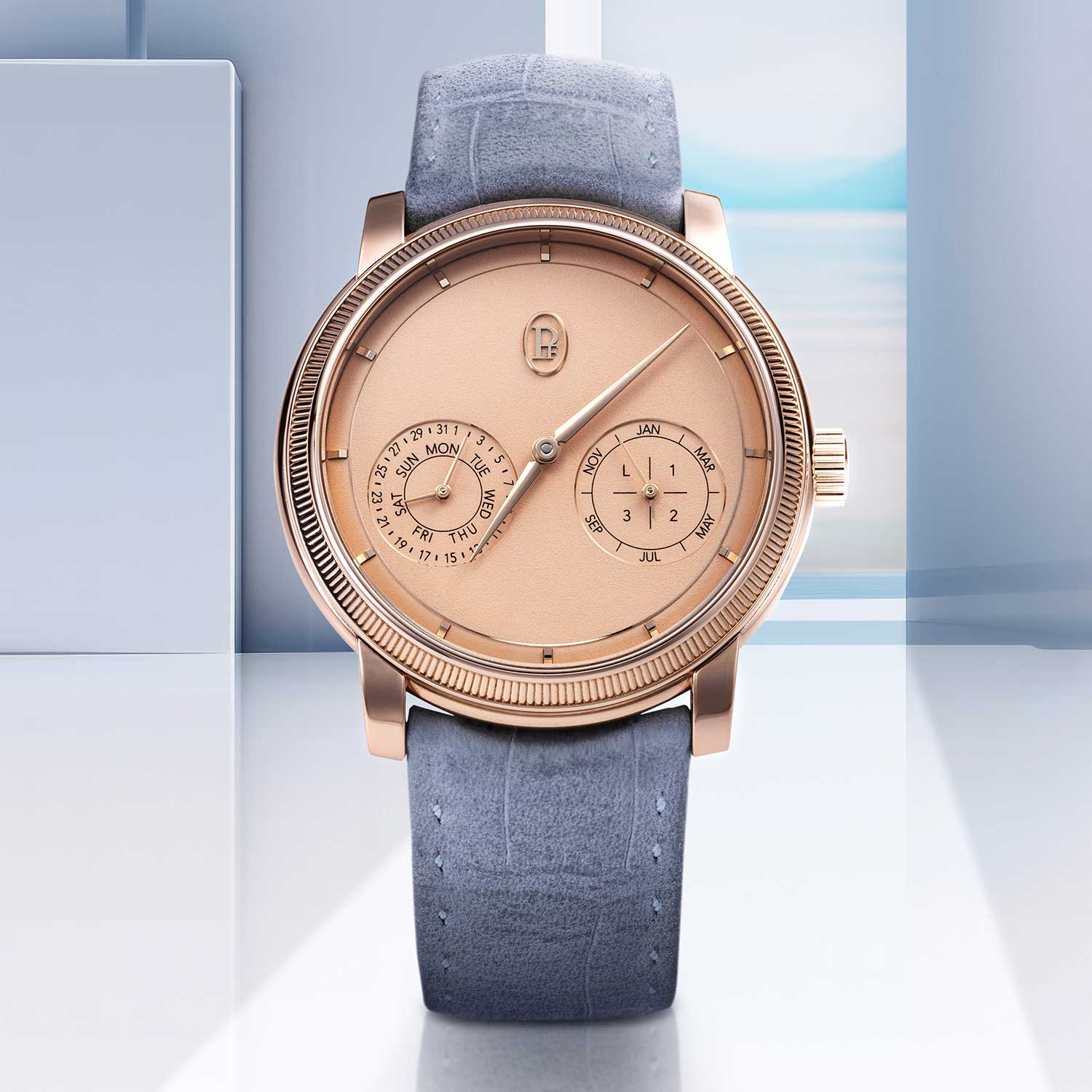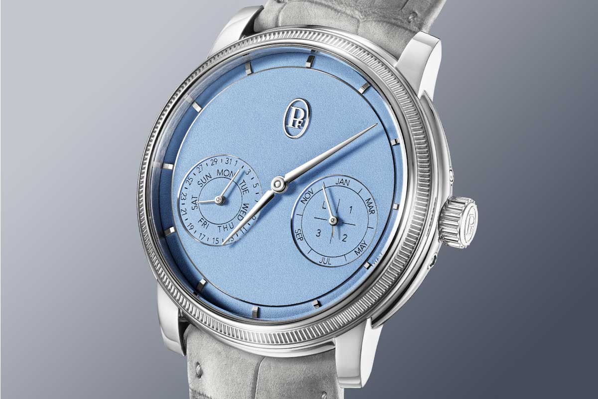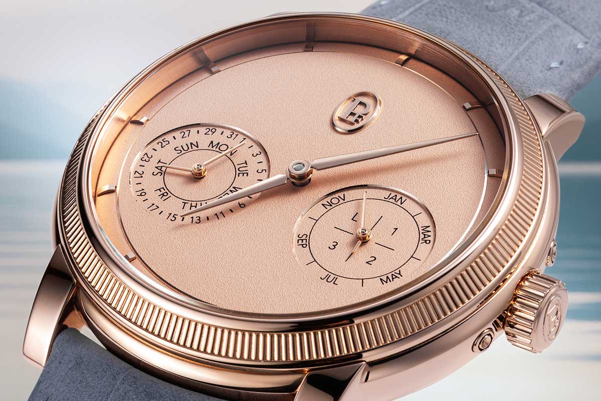“We love purity,” Terreni says. “I’m not a fan of busy dials.” The design team split the calendar information into two co-axial counters positioned just under the 3 and 9 o’clock horizon. No disk overlaps, there are no lopsided masses of text. The day and the month are read effortlessly; the date, naturally; the leap-year indication is integrated without theatrics. The moonphase was eliminated altogether. “It’s an additional information,” Terreni shrugs. “It’s pleasant but tangential to the complication’s essence.”