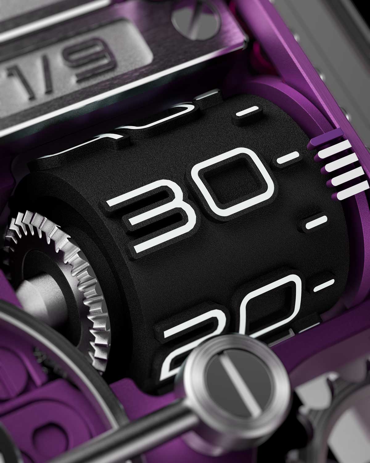 This latest collab with Halter was inspired by an old-fashioned electric meter and, accordingly, it is christened KWH, a reference to the kilowatt, the unit of measurement for electrical energy. It also draws on the classic video game called Snake, where the player controls a line that moves up, down, right, left to eat food and grow. Here, Behren’s chain-driven hour display takes center stage. The chain runs on the perimeter of the movement and completes one circuit in 12 hours.