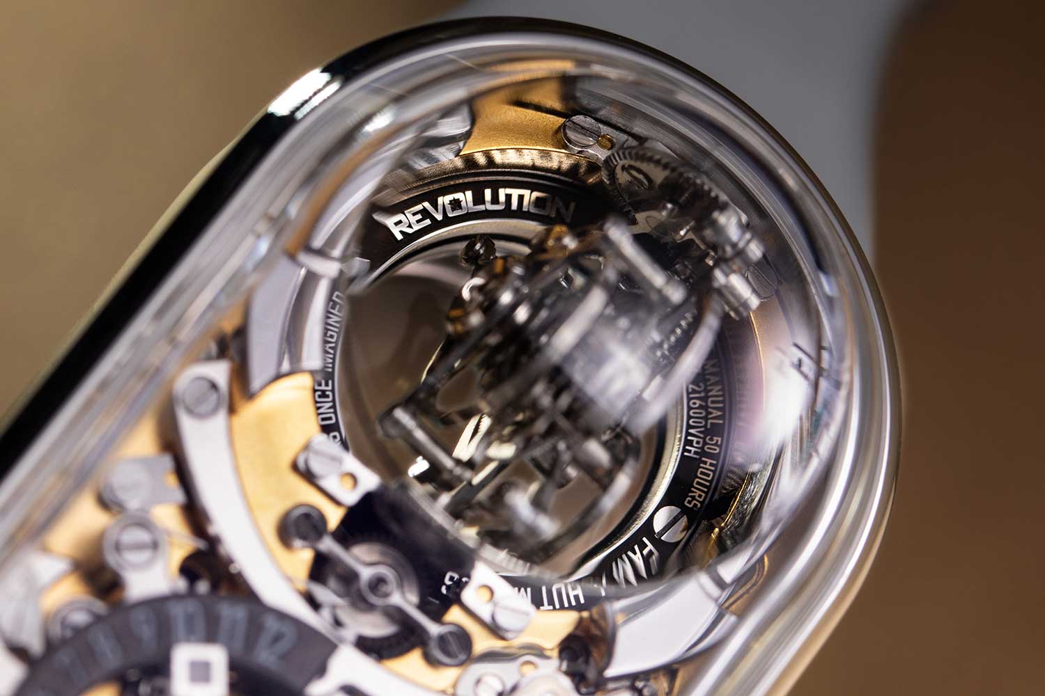 For our edition, the details matter. We replaced the original gunmetal baseplate with a frosted gold finish, added a gold “20” on the retrograde minutes as a nod to our anniversary, and proudly engraved “Revolution” on the 15.55mm tourbillon frame. The complication suite is as captivating as ever: a bi-axis tourbillon, retrograde jumping hours and retrograde minutes.