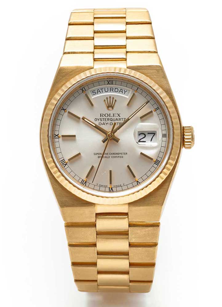 A Rolex Day-Date Oysterquartz ref. 19168 in 18k yellow gold, decorated with diamonds and sapphires; sold on 9 May 2015 for CHF93,750 (Image: Phillips)