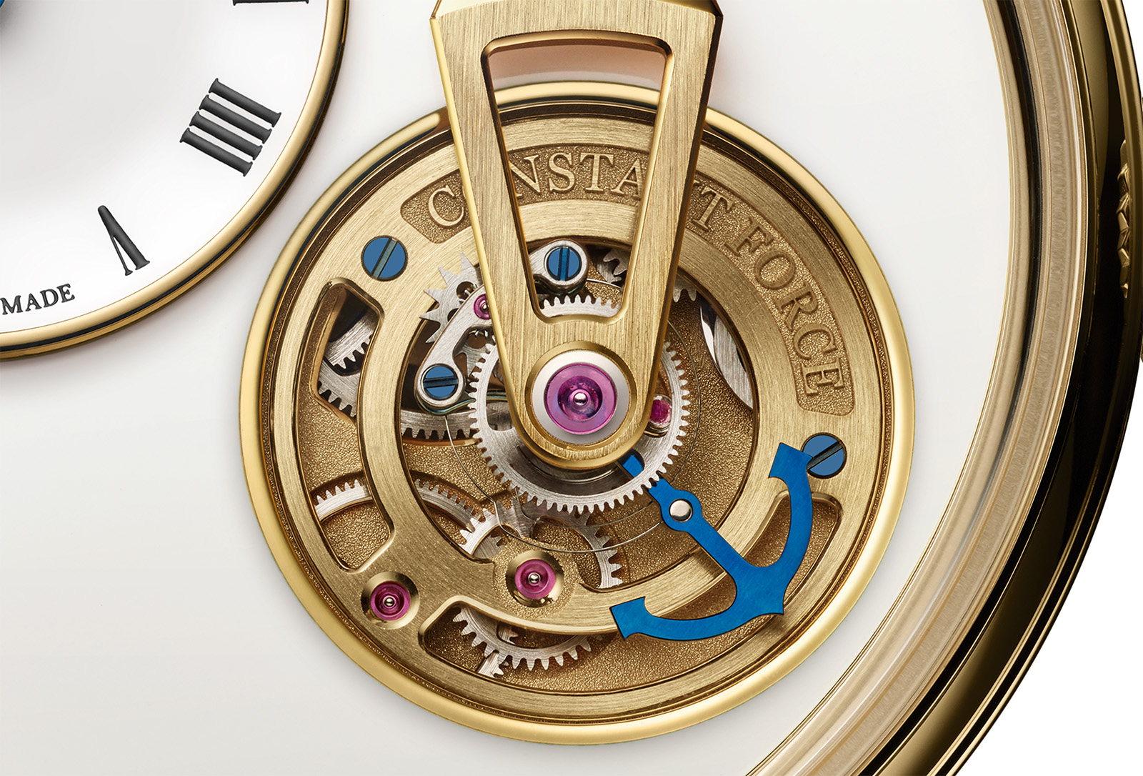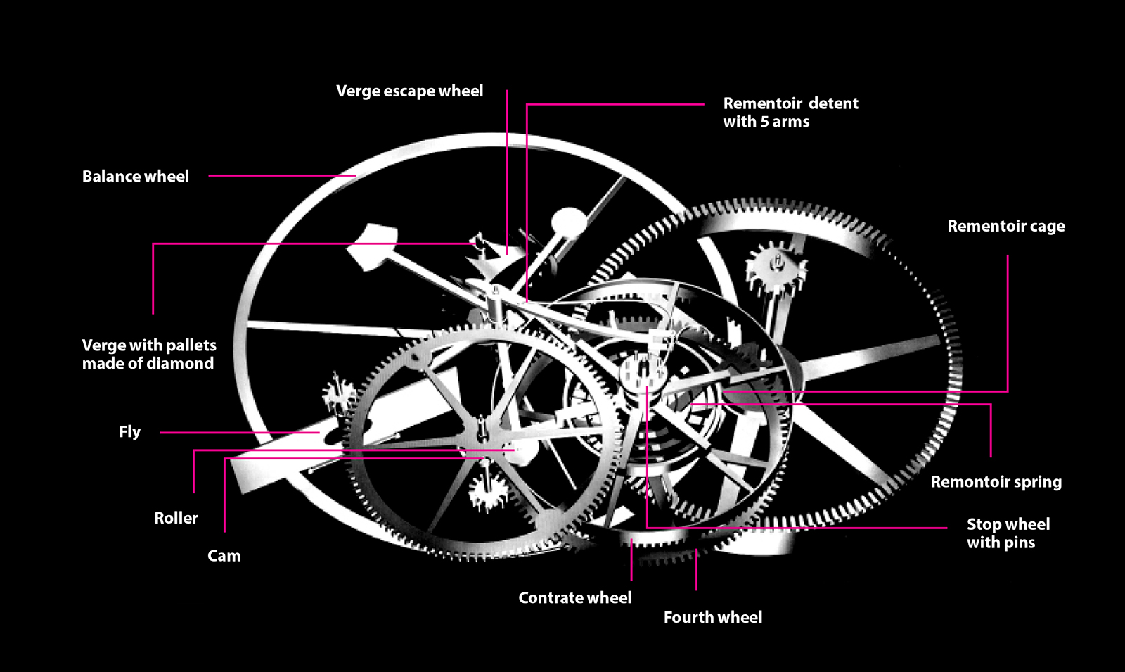 The tourbillon cage has four protrusions, each carrying a small pin that trips a pallet jewel on the tip of a lever. A secondary lever attached to it then releases the remontoir train to power the remontoir spring located beneath the tourbillon cage