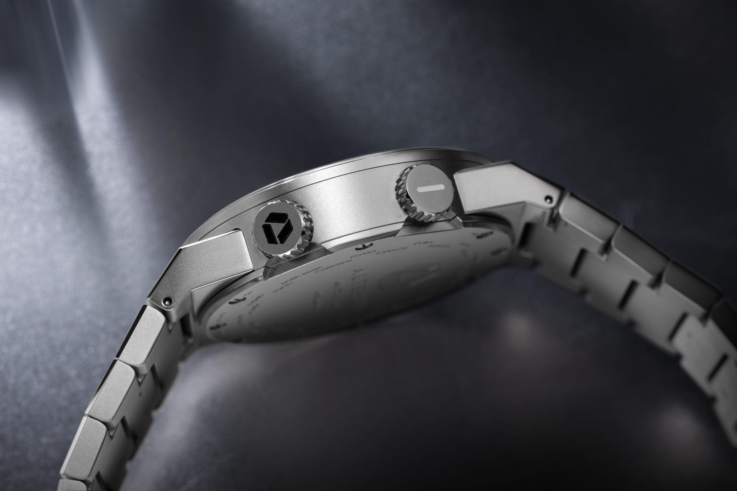 Two crowns sit at 2 and 4 o’clock, slightly recessed into the case and bearing a white line and the Alterum logo respectively. The former lets you set the bidirectional city disk while the latter winds the watch and sets the time.