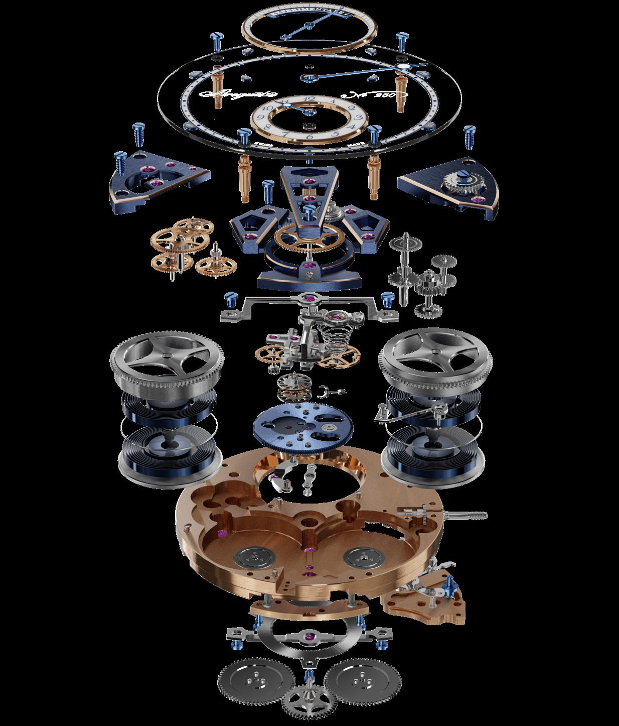 An exploded view of the Expérimentale 1 reveals the complex layering of the magnetic escapement, tourbillon carriage, and dual mainspring barrels