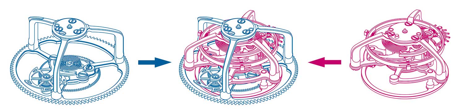 Meanwhile, the inner tourbillon cage drives the escape wheel around the fixed fourth wheel. So, it would not be correct to say that the one‑second remontoir here directly drives the escape wheel, as in the Pratt/Gafner model (which will be detailed later), but that it drives the cage, which in turn drives the escapement, which impulses the balance wheel. Clearly, every effort was made to keep every component in this assembly as light as possible, hence the ultra skeletonized escapement wheel created with MEMS (Micro‑Electro‑Mechanical Systems) technology. The end result is a watch that is not only a work of technical brilliance, but also extraordinarily beautiful to watch.