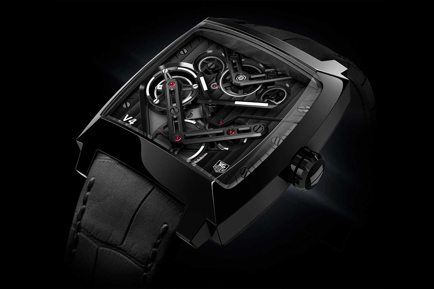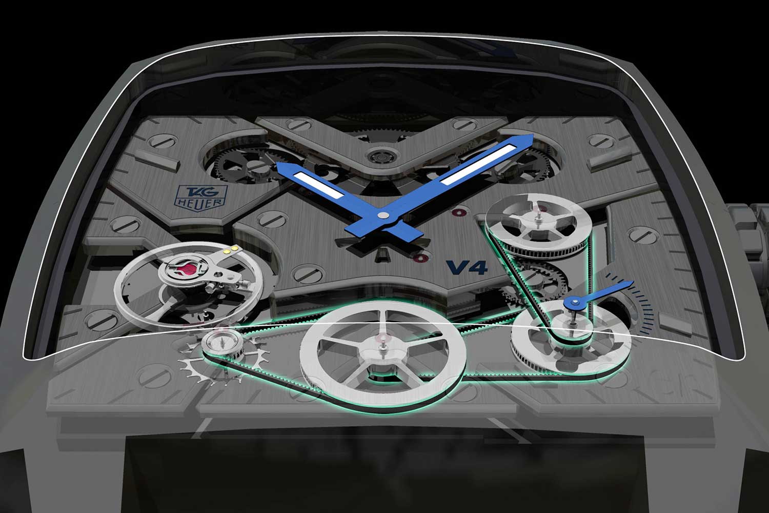At the 2004 Baselworld fair, TAG Heuer unveiled the Monaco V4 as a concept, before bringing it into production in 2009. Departing from traditional gear- driven mechanisms, it introduced a belt-driven movement that used five notched belts with tension regulated by two turnbuckles. Power came from a linear tungsten mass that moved along a track to wind four barrels, arranged in a V-shape and inclined at 13 degrees.