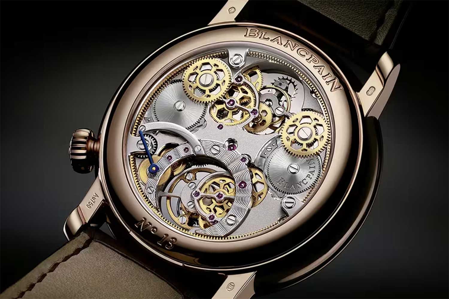 Naturally, in the Blancpain Villeret Tourbillon Carrousel, both oscillators are powered by their own barrels and gear trains. The hand-winding mechanism is designed with a differential to distribute power equally to the two barrel ratchets when the watch is wound. At the same time, it regulates the rotational speeds of the barrels based on the mean speed of the two regulating systems and transmits this output directly to the time display. Set side by side, the two mechanisms offer a powerful visual comparison, with their distinct kinematics laid bare as parallel philosophies in the struggle with gravity.