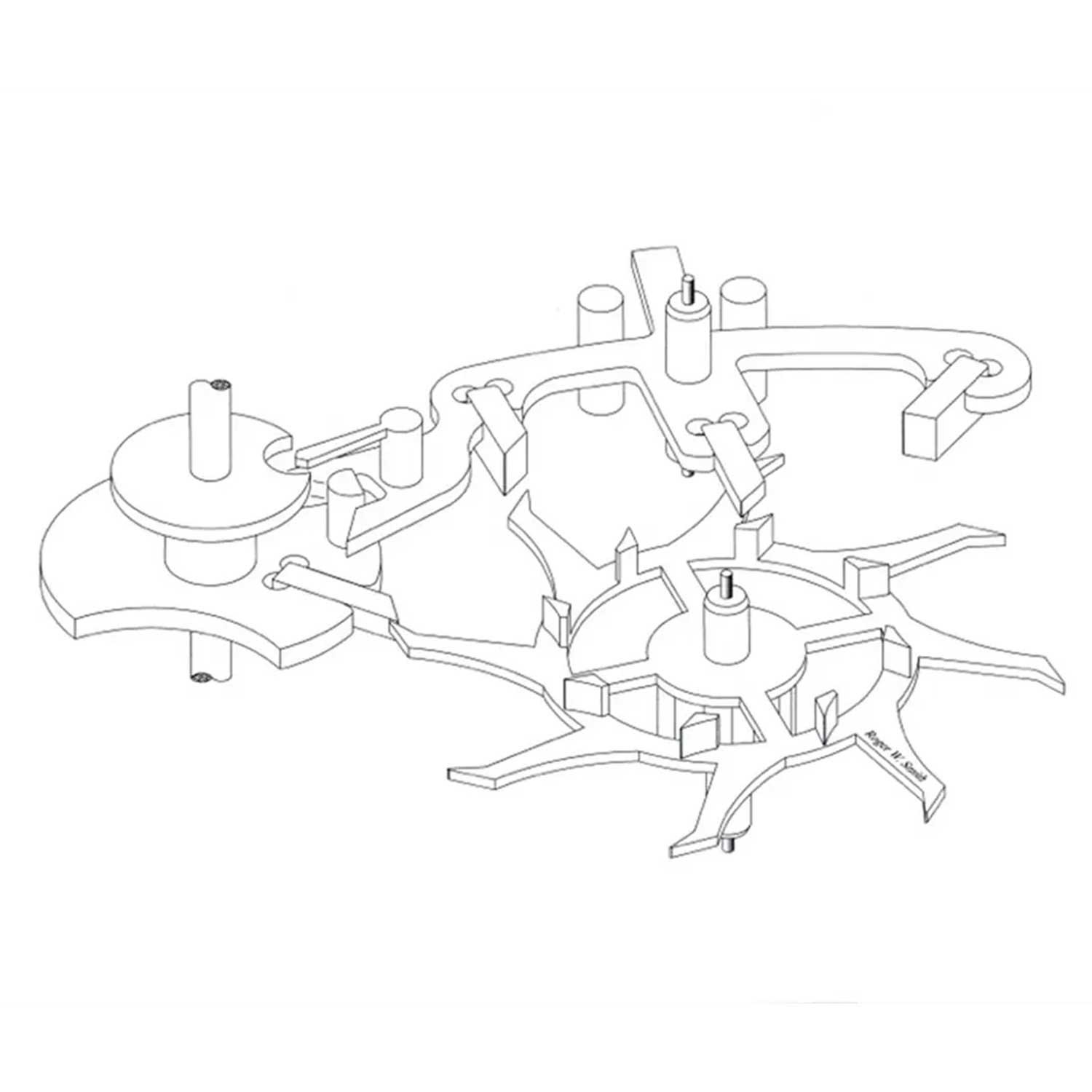 - Roger designed the single wheel version of the co-axial escapement (version 1) by transferring the teeth of the upper impulse wheel onto the lower wheel. This improvement ensured concentricity and fixed angular orientation of the two sets of teeth