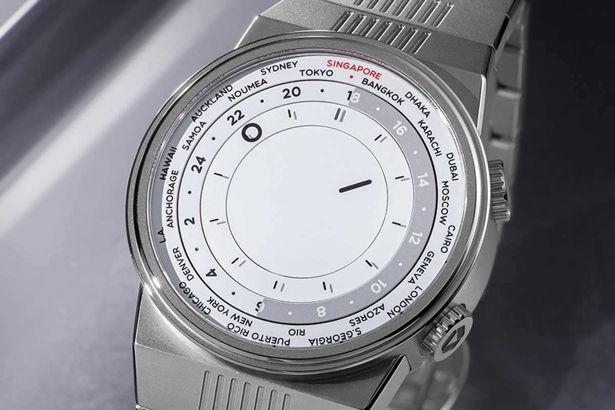 Dial White with four concentric disks, representing hours, minutes and world time; 24 time zones printed on outermost disk, with “Singapore” marked in red in honor of the city-state that is home to Revolution’s founding HQ