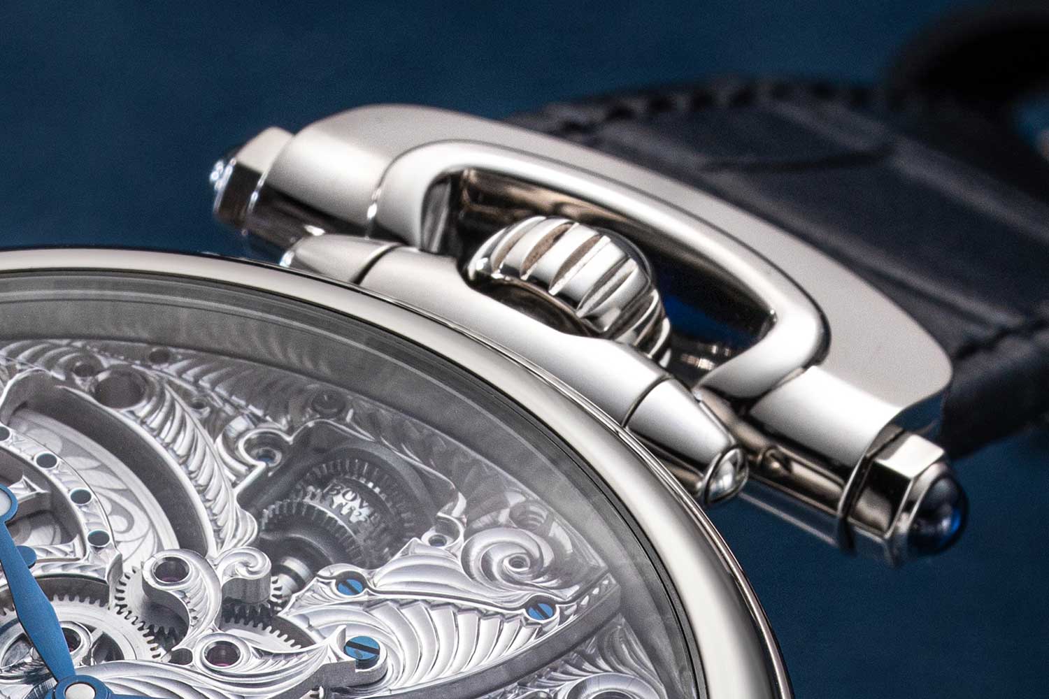 Bovet is famous for its cases — and with good reason. The ornate and idiosyncratic designs are treated with a level of care and respect that matches every other aspect of the watch, and the Virtuoso XI takes as its case the brand’s famous “Writing Desk,” one of the few available in the Fleurier collection. Not only does this design honor Bovet’s legacy in pocket watches, with its placement of the crown and bow at 12, but the case itself is sloped, meaning it is thicker at the top and more slender at the bottom.