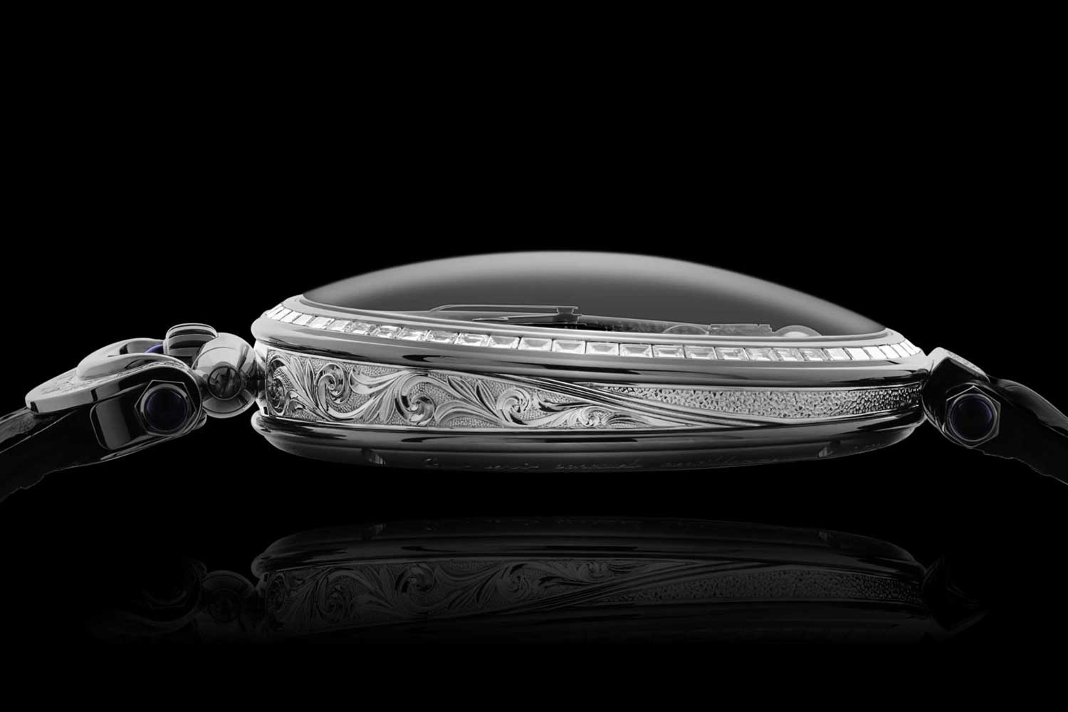 Of course, when you look at this watch, it’s immediately apparent that the focus is less on the technical watchmaking and more on the artistry. And what artistry. Every single surface of this watch, inside and out, has been finished to a level and with such a virtuosity that the name is well and truly earned. The hand engraving of the case and caliber is the result of around 60 hours of painstaking and highly skilled work, made even more demanding by the fact that if any single stroke of the engraver’s tools — used under a microscope — goes astray, hours and hours of effort are instantly ruined.