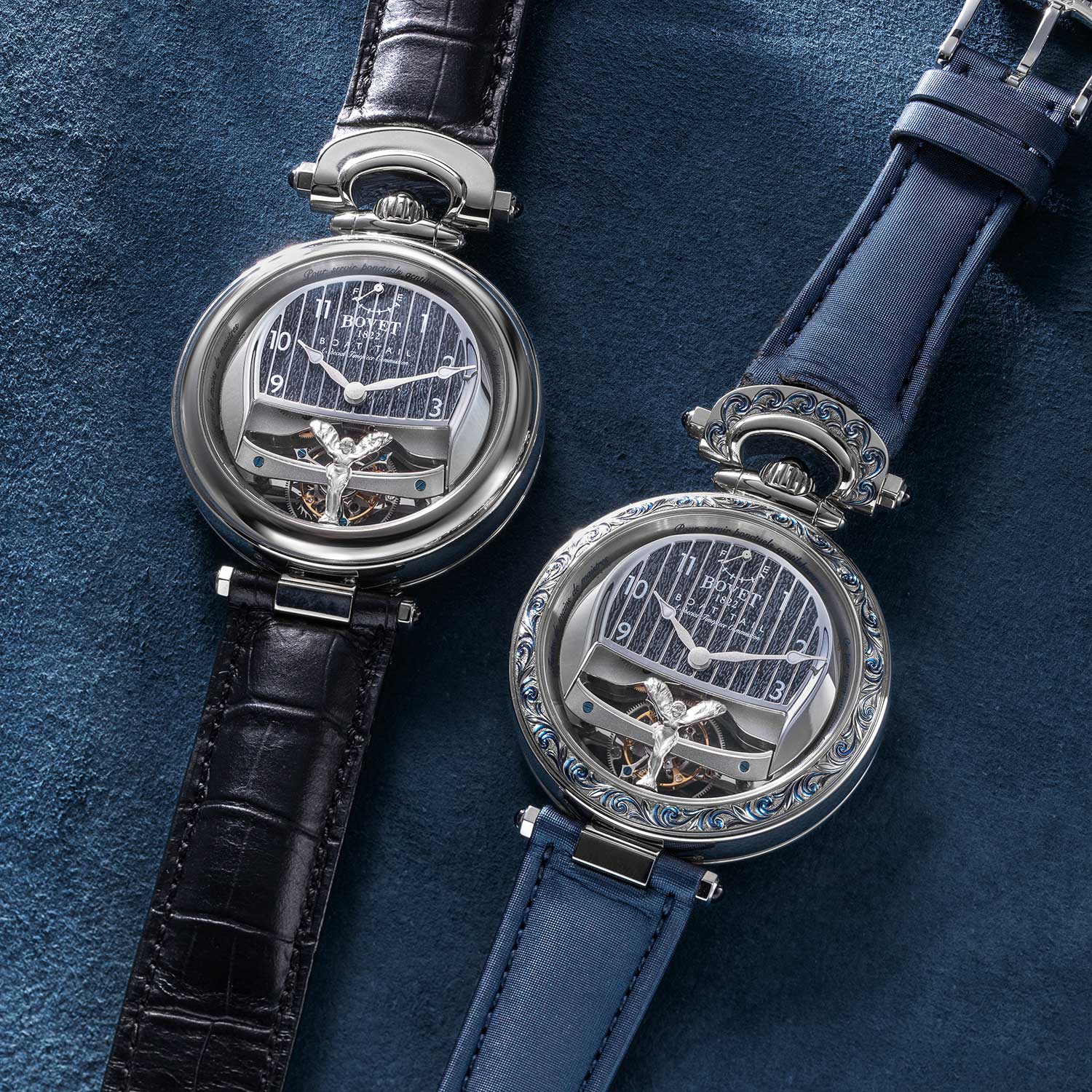 The movement in both is uniquely suited to this diverse-use case, a manually wound manufacture caliber, with a tourbillon and five days of power reserve. Interestingly, the tourbillons used in this pair are bespoke, as Bovet was concerned about the impact of vibration from the dash-mounted position on the accuracy of the watch. Bovet swapped out its usual ball bearings in favor of pivots for the mounting system and increased the weight of the balance wheel — a move that caused a drop in power reserve, but increased accuracy.