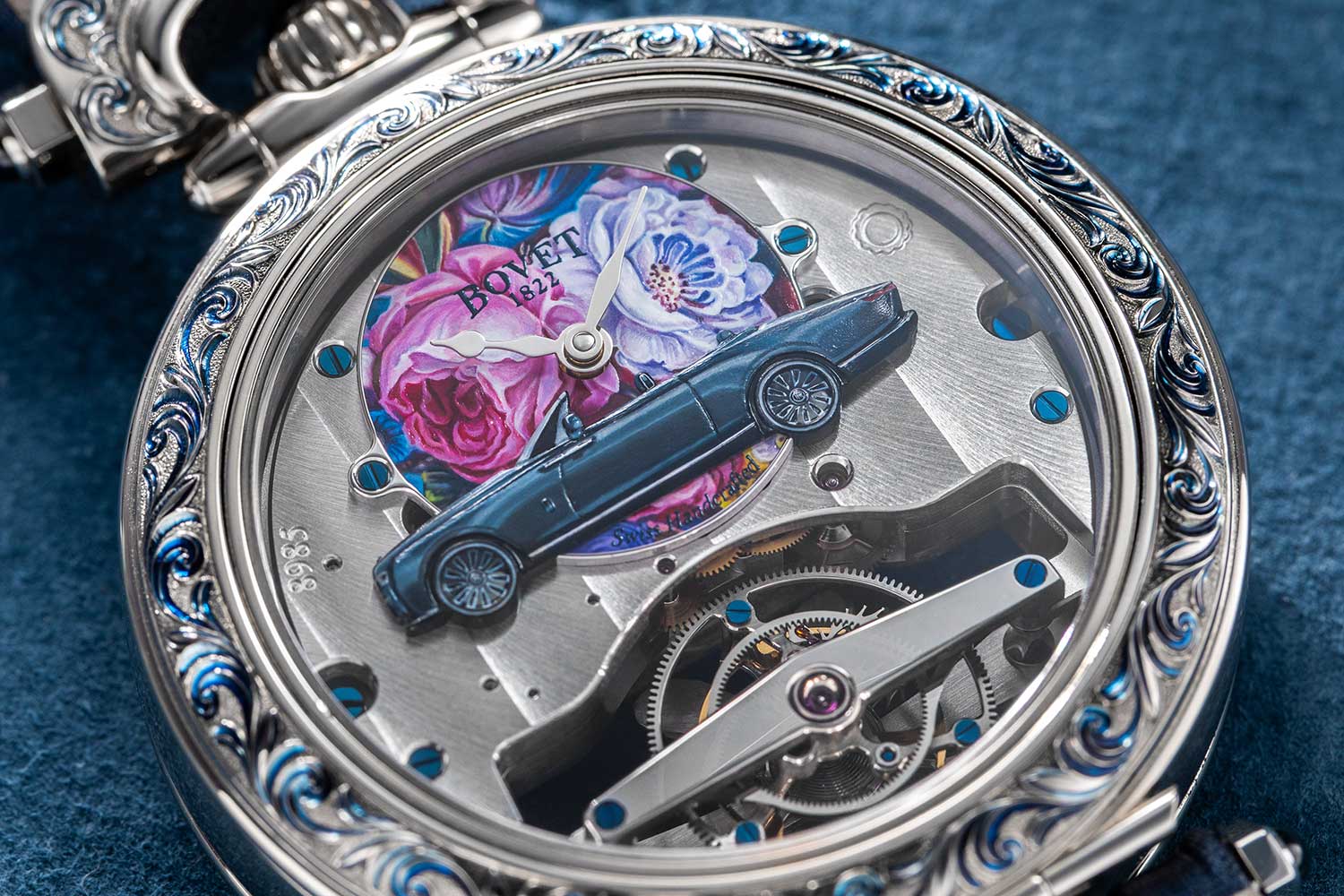 The lady’s watch follows a similar formula, with a front dial in wood marquetry and the Spirit of Ecstasy, with a rendering of the car on the rear, but the overall treatment of this watch is even more ornate. The case itself is covered with delicate engraving, filled in with blue lacquer, a simultaneous reference to Bovet’s pocket-watch legacy and the car for which the watches are commissioned. It is the rear dial of the lady’s watch that is particularly stunning — the rich mother-of-pearl dial features a complex and accomplished miniature painting of a floral bouquet, in which every detail was chosen in consultation with the owner.