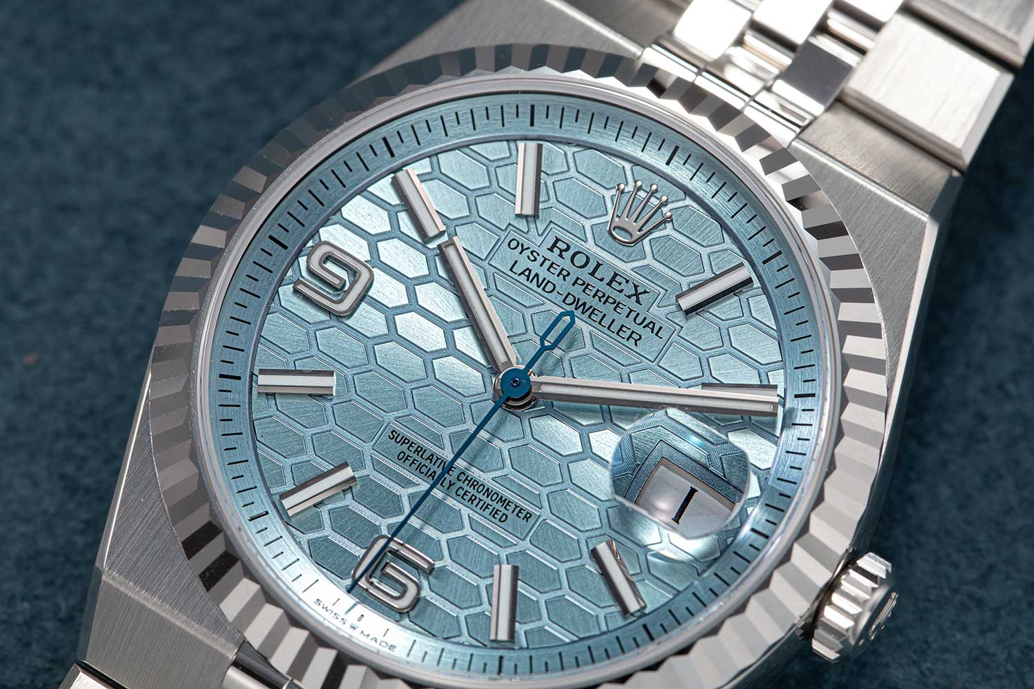 The dials on all versions invariably feature a honeycomb motif executed with femtosecond lasers. This technique was previously used in Datejust 31 and 36 models, which featured patterned dials such as floral, palm and fluted motifs. These dials combine traditional sunray finish with femtosecond laser engraving to create matte or grained surfaces. The process involves two distinct decorating techniques — surface structuring followed by a deep engraving with a femtosecond laser.