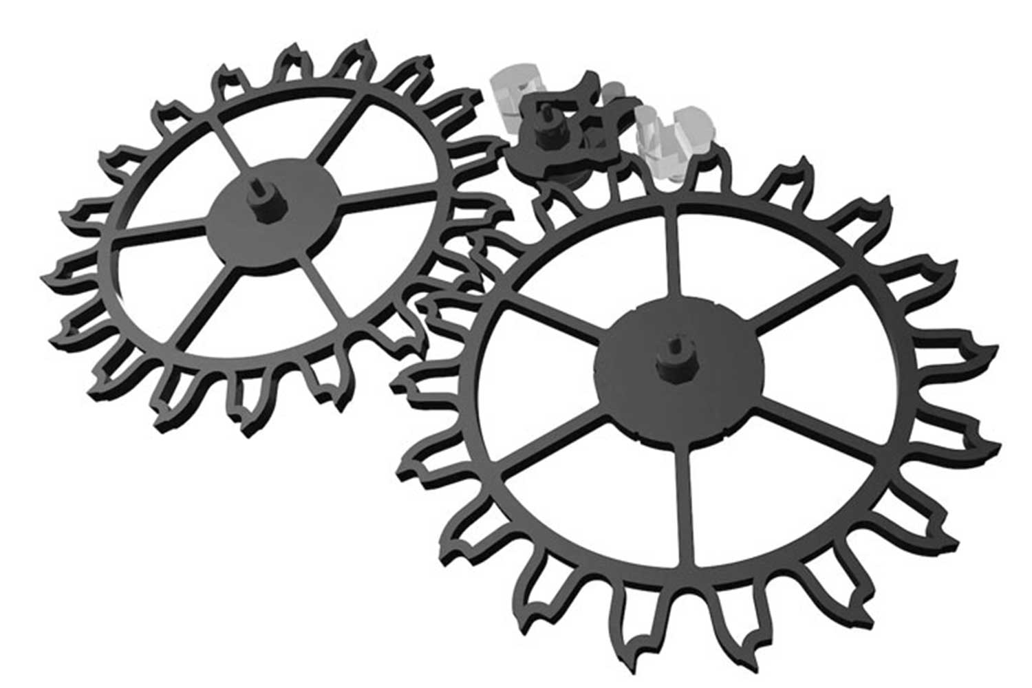 The escape wheels are identical and symmetrical, allowing inversion during assembly.