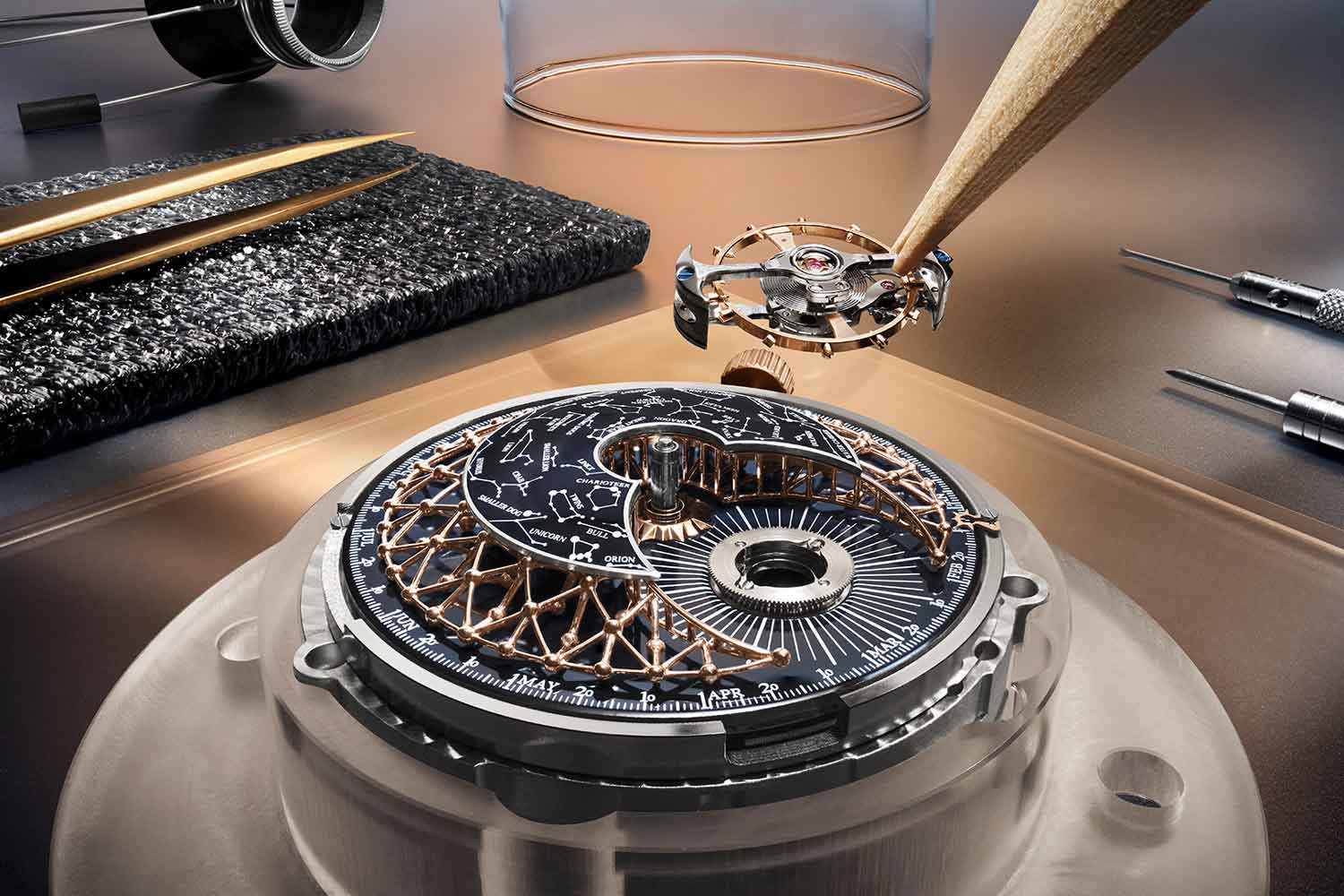 The enamelled sky chart, while slightly smaller than on previous iterations, leaves more room for the intricate golden-colored lattice structure