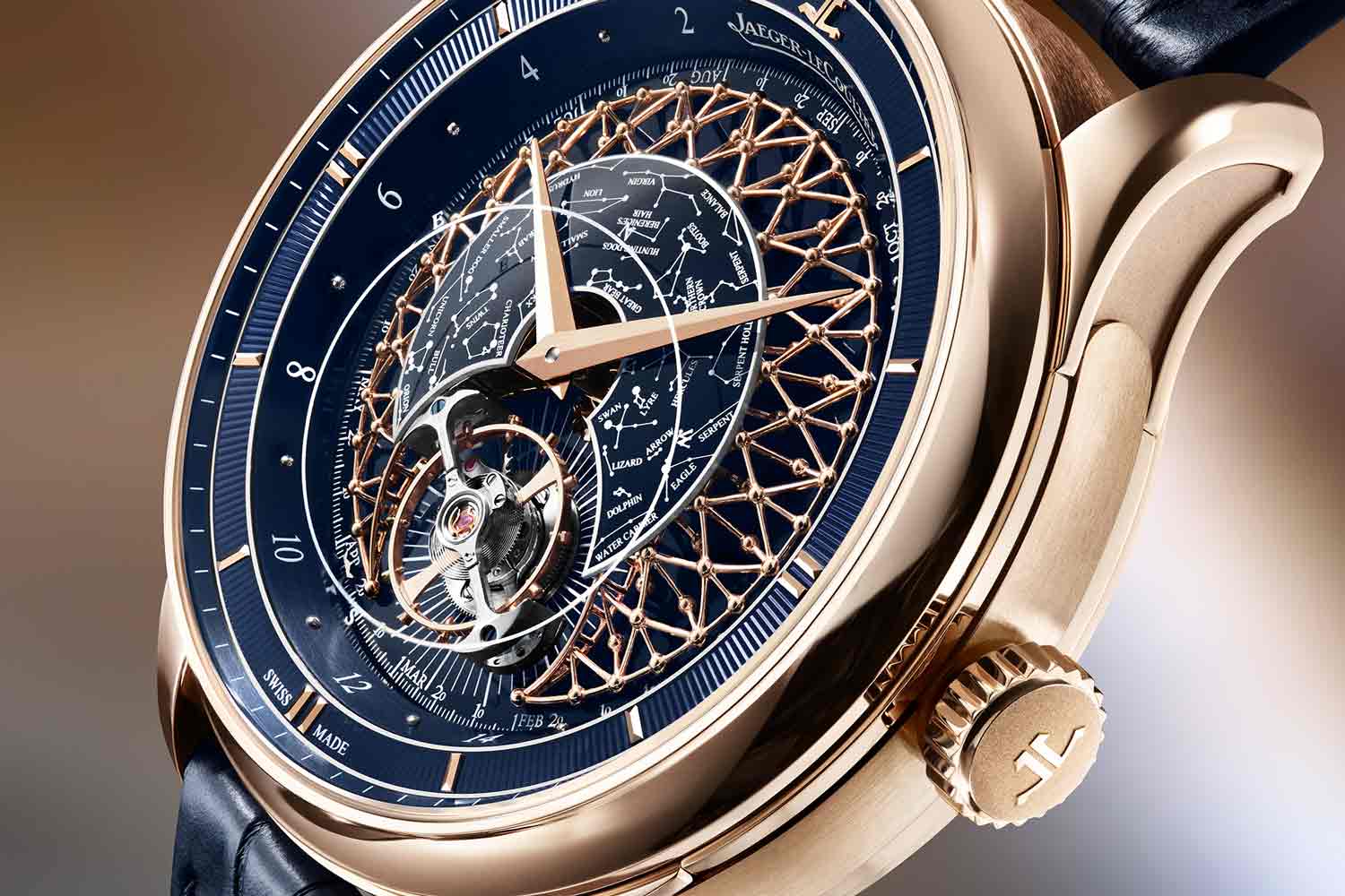 That brings us to the next complication, which takes up most of the dial: the sky chart. The chart moves in tandem with the tourbillon, revolving around the centre of the dial once every sidereal day. In doing so, it depicts the movement of the constellations across the heavens in real time. This particular chart is based on the view of the Northern Hemisphere sky as seen from Jaeger-LeCoultre’s workshop in the Vallée de Joux.