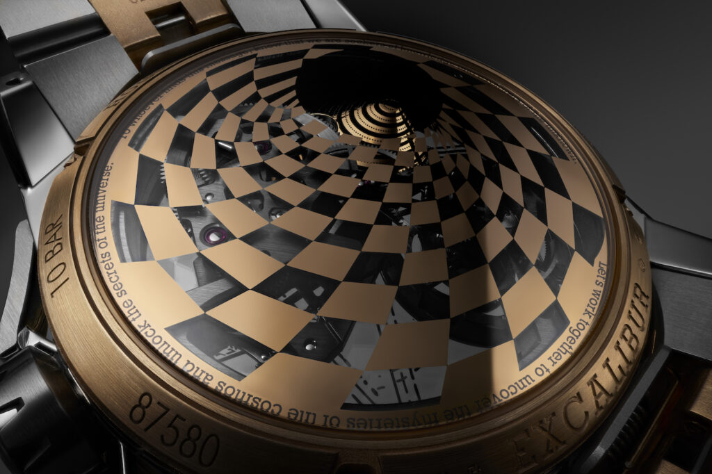 Starting at the top, the sapphire dial sees a laser-engraved golden rocket chart a path across the dial in the shape of Roger Dubuis’ famous star, leaving a glittering trail and also a message: “We come in peace”. Beyond that, there’s a golden representation of a singularity (AKA a black hole) at 10 o’clock, creating a hypnotic vortex-like effect. There’s also a tiny spider (Dr. Woo’s signature) hidden at 10, just lurking in a golden galaxy. In a particularly nice example of visual storytelling, this black hole is evident on the back of the watch, where the black hole is surrounded by a chequerboard pattern that visually represents the weight and distortion these powerful phenomena have.