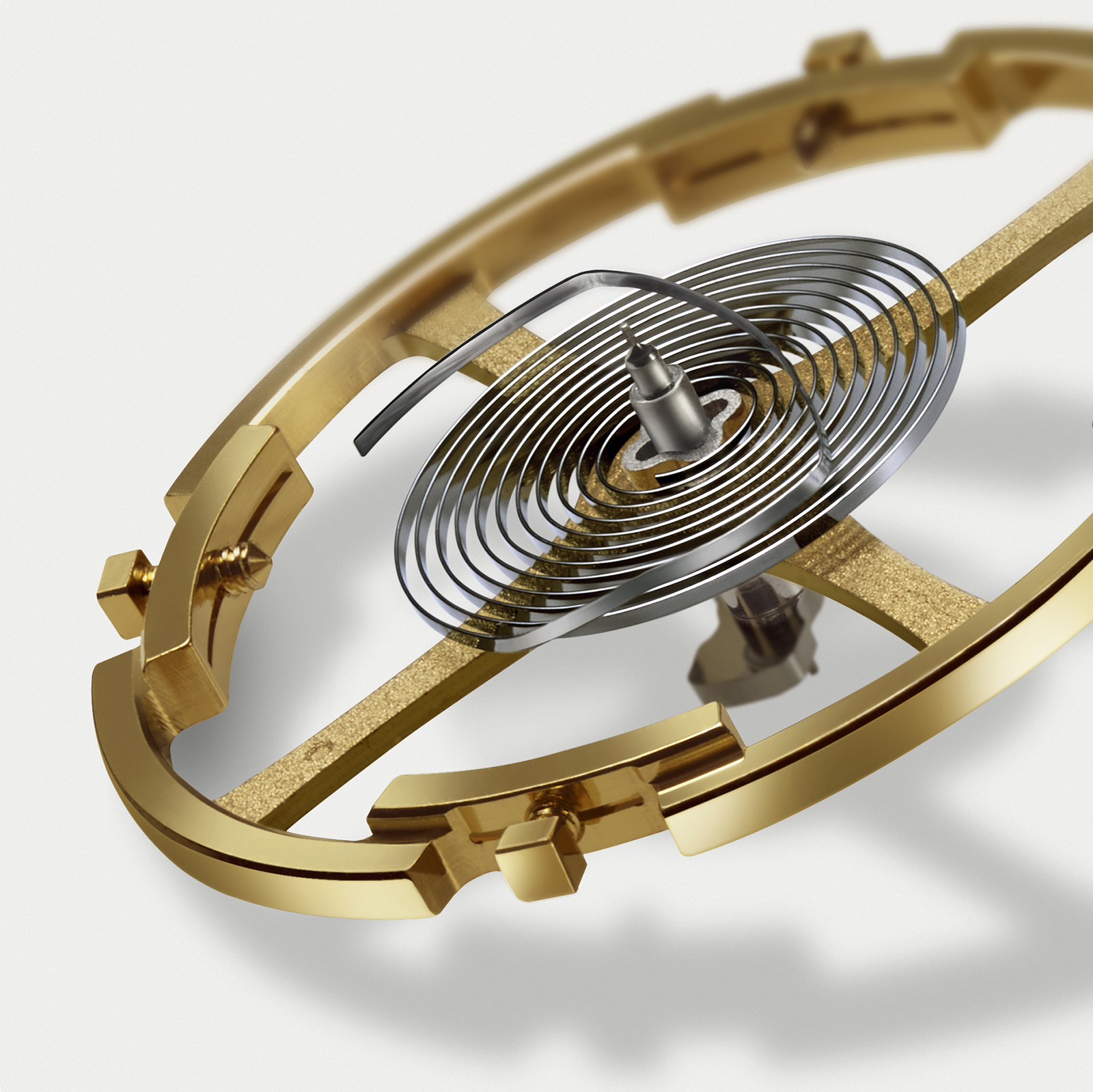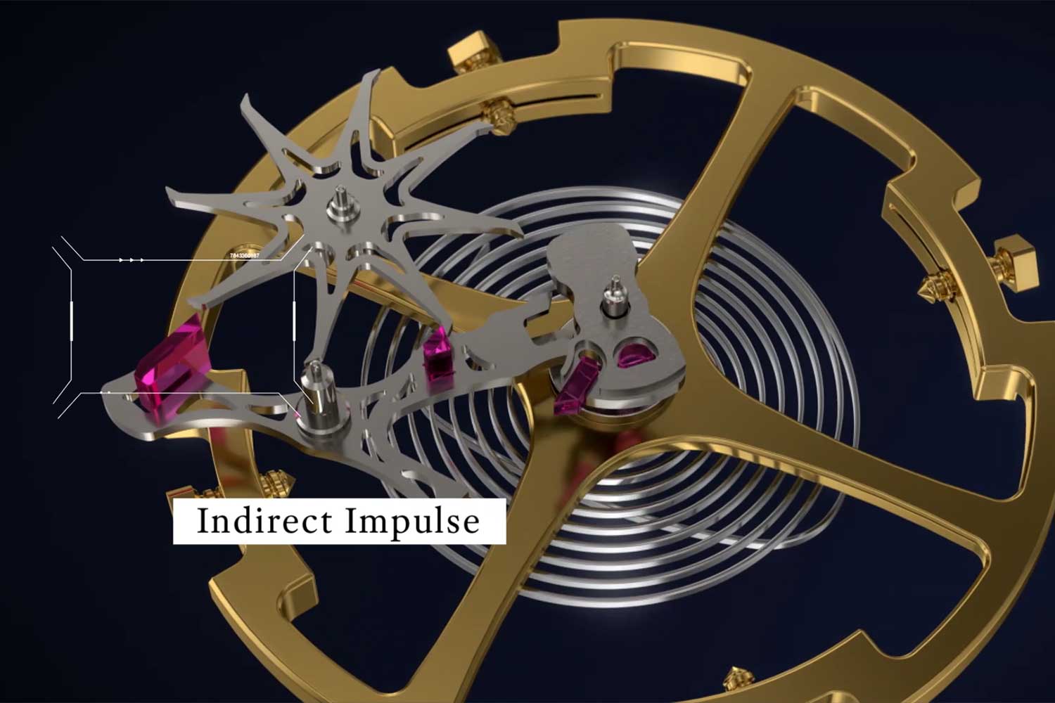 The free-sprung balance is attached to an overcoil hairspring with a very specific terminal curve that was optimized through 80,000 simulations to minimise positional error and maximise isochronism