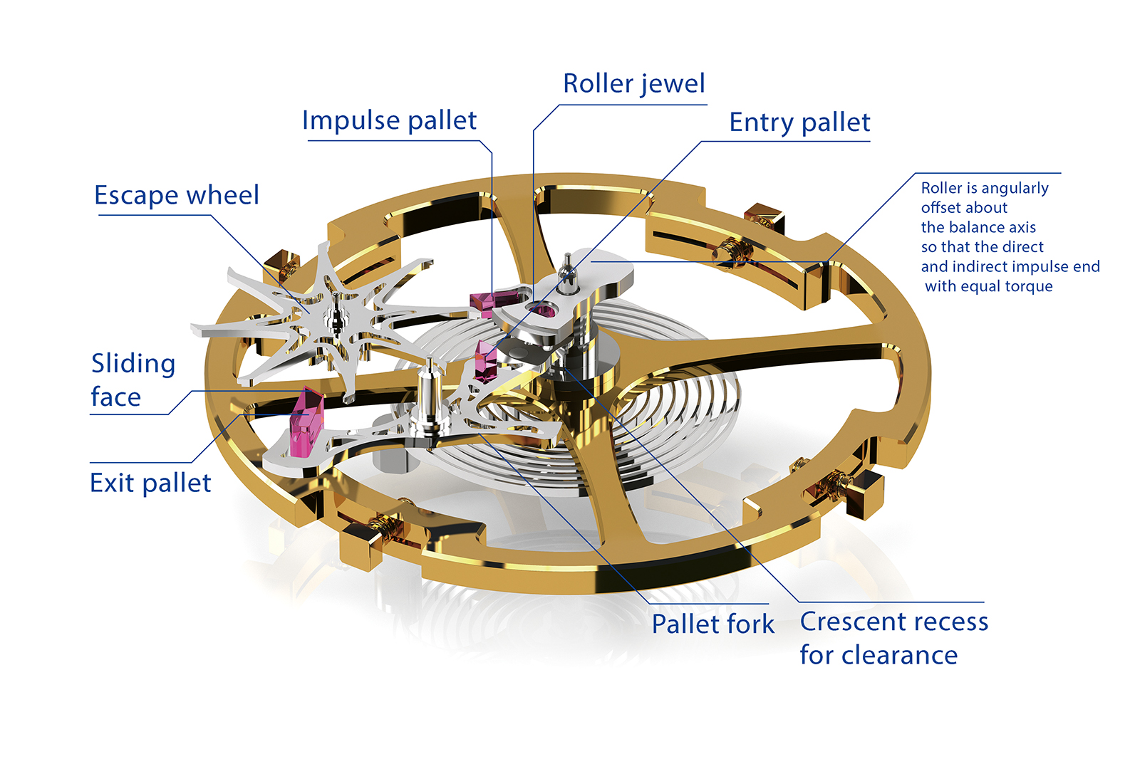 The geometry of the roller is unusual. Its center, when viewed from above, is not exactly on the line connecting the balance axis and the pallet fork axis, but offset by a small angle. This offset alters the leverage of the impulses. The indirect impulse (tooth against the exit pallet, through the fork and into the roller jewel) has more links and more angular transmission than the direct impulse. That means a small change in the angle of action greatly affects how much torque is available at the end of the contact. Without offset, the geometry puts this impulse at a disadvantage. As barrel torque declines, the restoring torque of the hairspring overtakes it sooner.