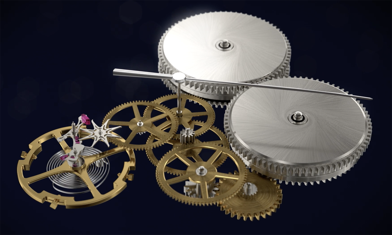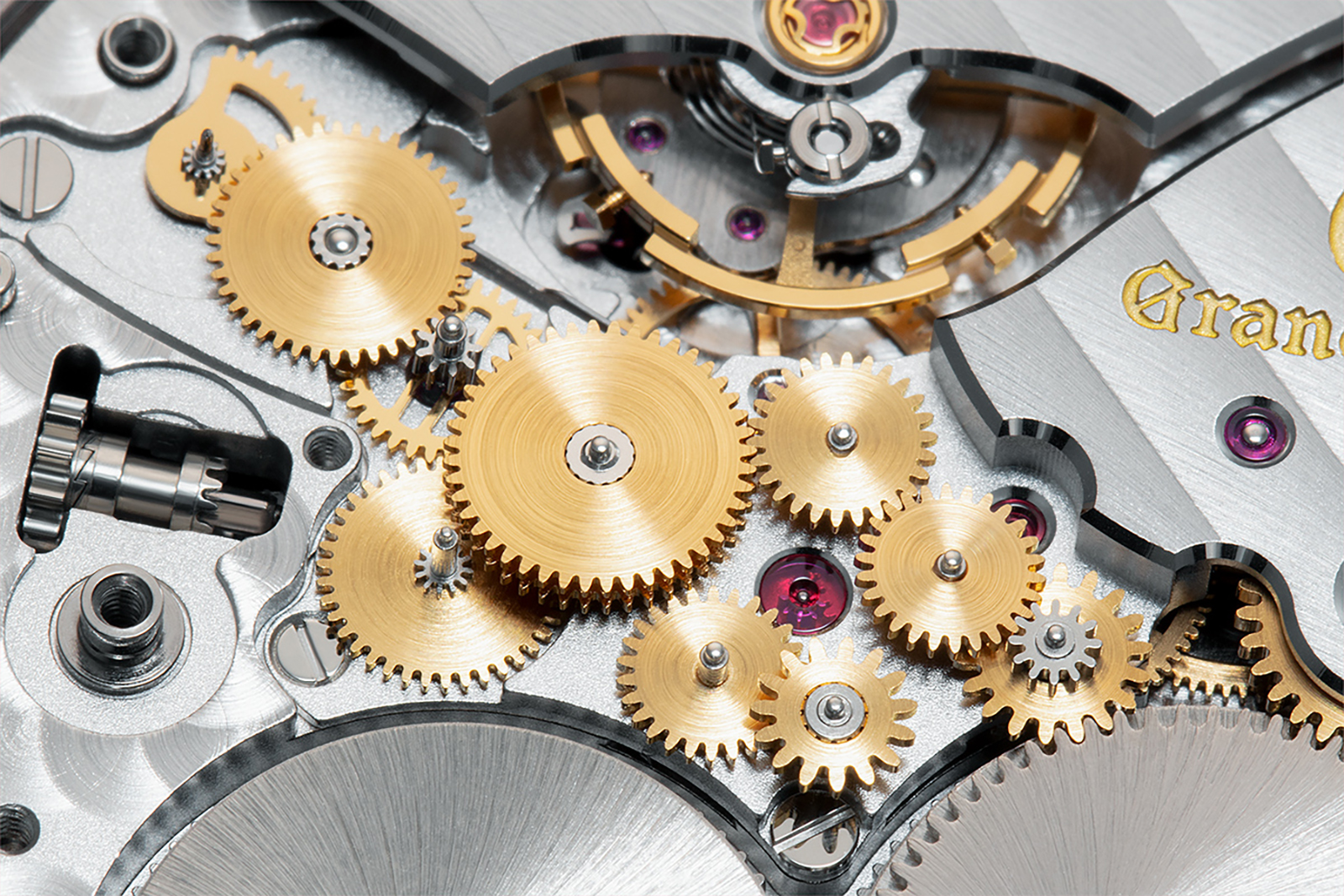 To fit within a remarkably tight space, the power reserve differential train is composed of numerous small-diameter gears, each with a tooth profile designed to improve transmission efficiency