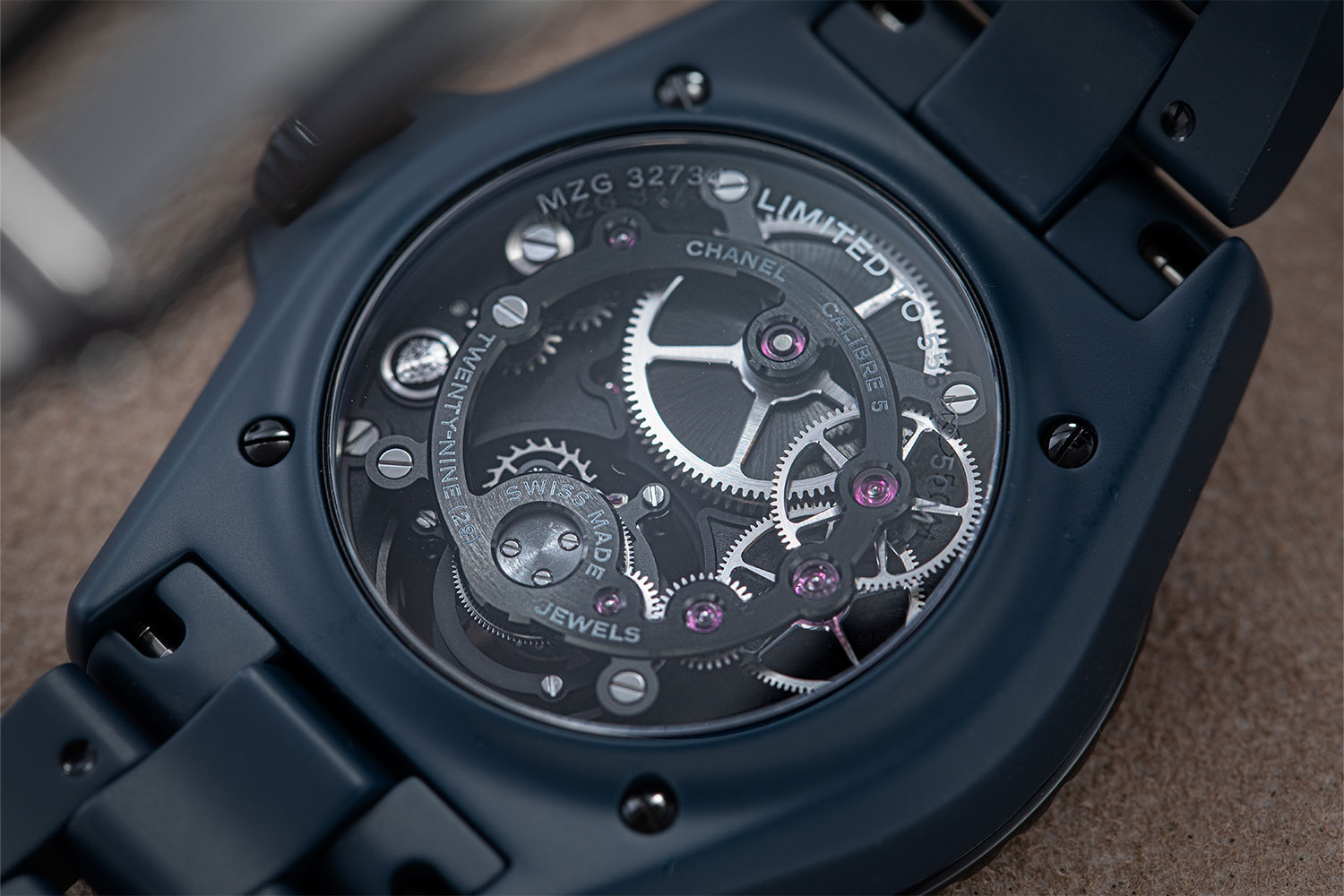 Put the J12 Bleu X-Ray or J12 Bleu Diamond Tourbillon Caliber 5 on your wrist and it’ll be obvious that Chastaingt has put a lot of thought into the watches’ ergonomics. Both are 38mm in diameter, which to my mind is the perfect size for an integrated bracelet sports chic watch. Both are characterized by a smoothness that is extremely pleasant on the wrist. At the same time, the visual presence of both timepieces is striking; your eyes are immediately drawn to them.